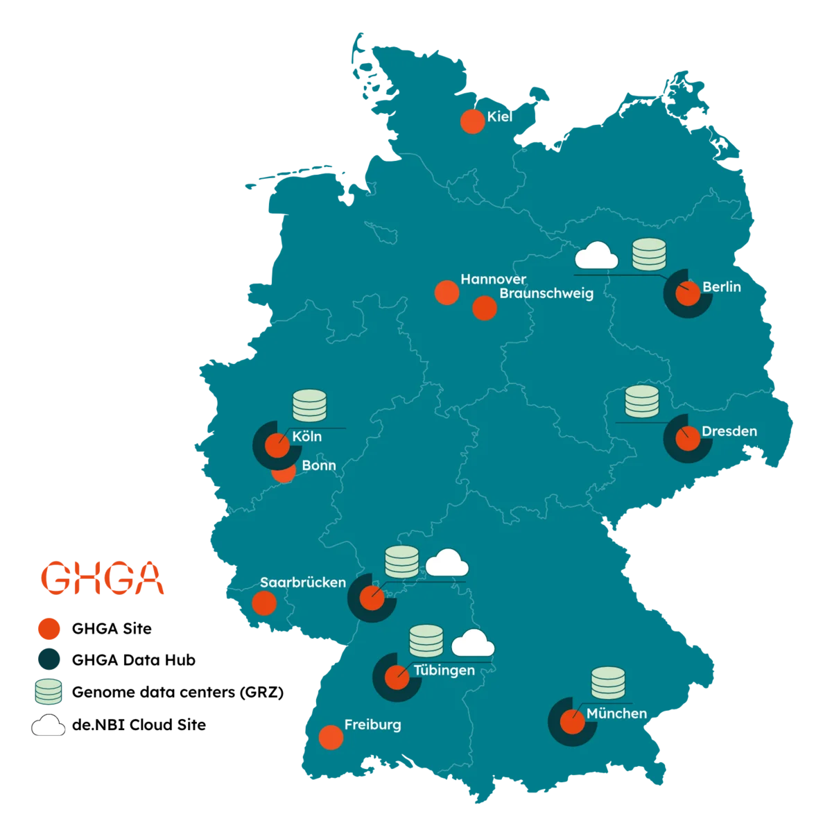 The GHGA data infrastructure is designed as a federated network: it consists of a central coordination node (GHGA Central) and several GHGA Data Hubs. These are located at six sites throughout Germany.