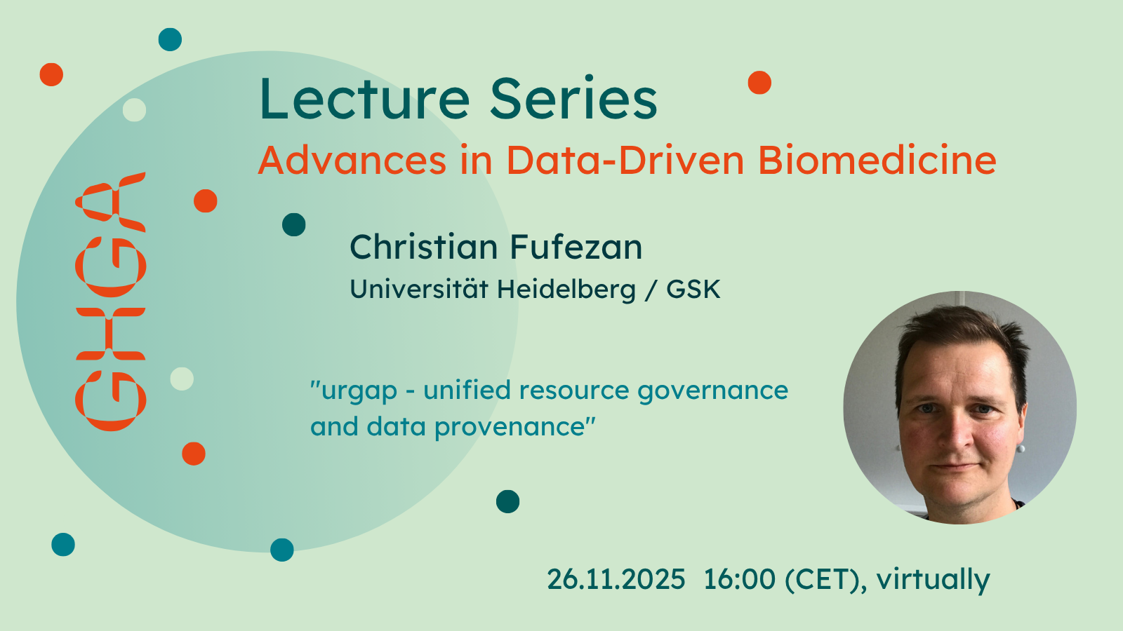 Christian Fufezan von der Universität Heidelberg und GlaxoSmithKline sprach am 26. November 2025 im Rahmen der GHGA-Vortragsreihe „Advances in Data-Driven Biomedicine” über „urgap – unified resource governance and data provenance”. Jetzt ansehen!