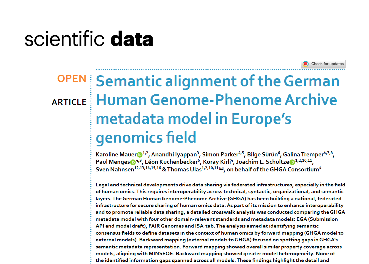 Interoperabilität zwischen Metadatenmodellen wird immer wichtiger, da Genomdateninfrastrukturen wachsen und zunehmend föderiert arbeiten. In unserer aktuellen Veröffentlichung in Scientific Data analysieren wir, wie das GHGA-Metadatenmodell im Vergleich zu vier etablierten Modellen im Bereich der Genomik aufgestellt ist.