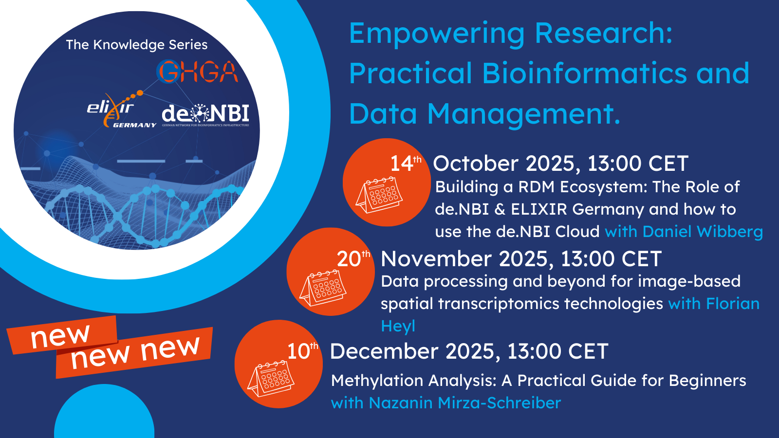 We're excited to announce a new webinar series designed to help researchers navigate the challenges of modern life science data. This series is a collaborative effort between the German Human Genome-Phenome Archive (GHGA) and de.NBI & ELIXIR Germany.